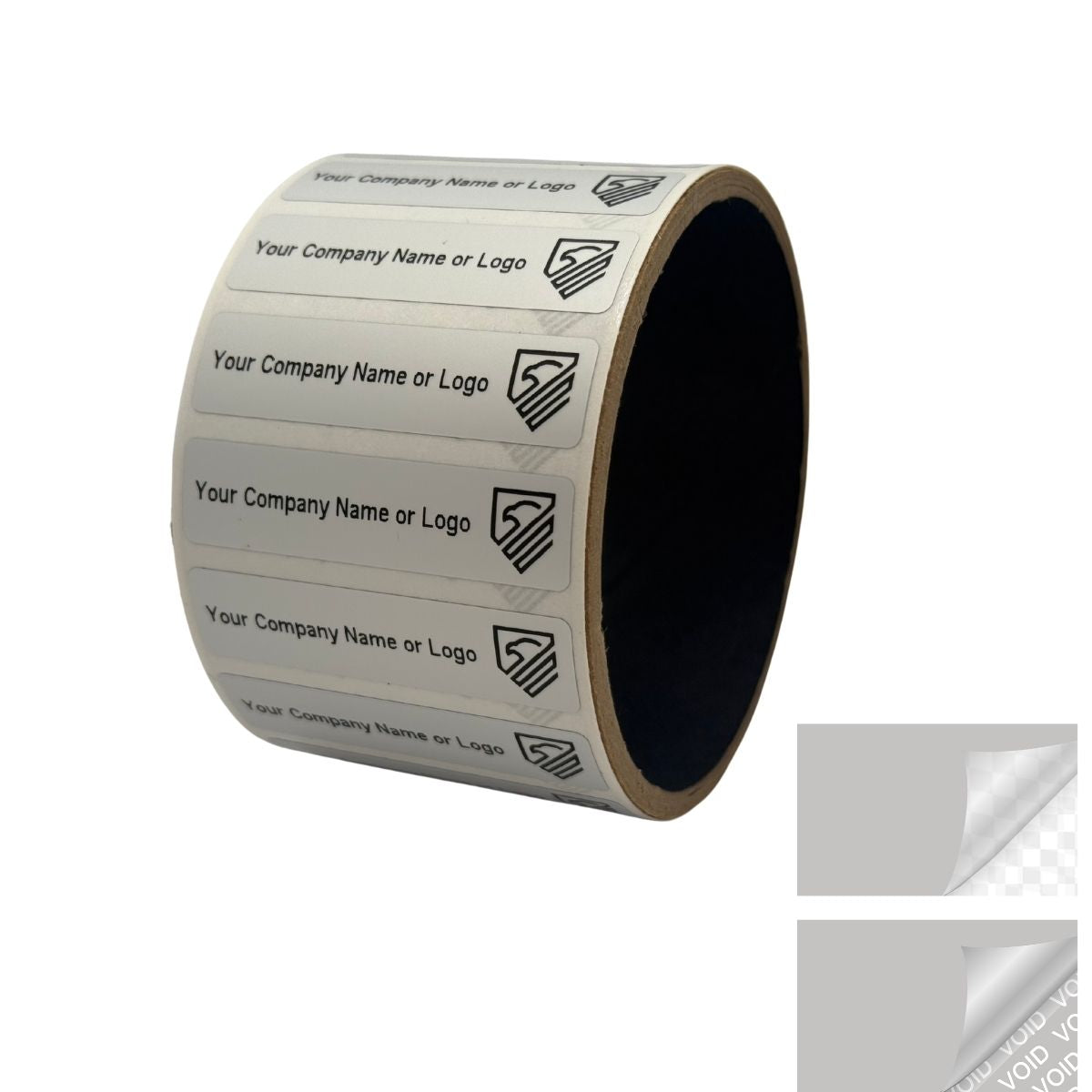 500 Tamper Evident Security Labels Silver Matte TamperVoidPro Seal Sticker, Rectangle 2" x 0.5" (51mm x 13mm). Custom Printed. >Click on item details to customize.