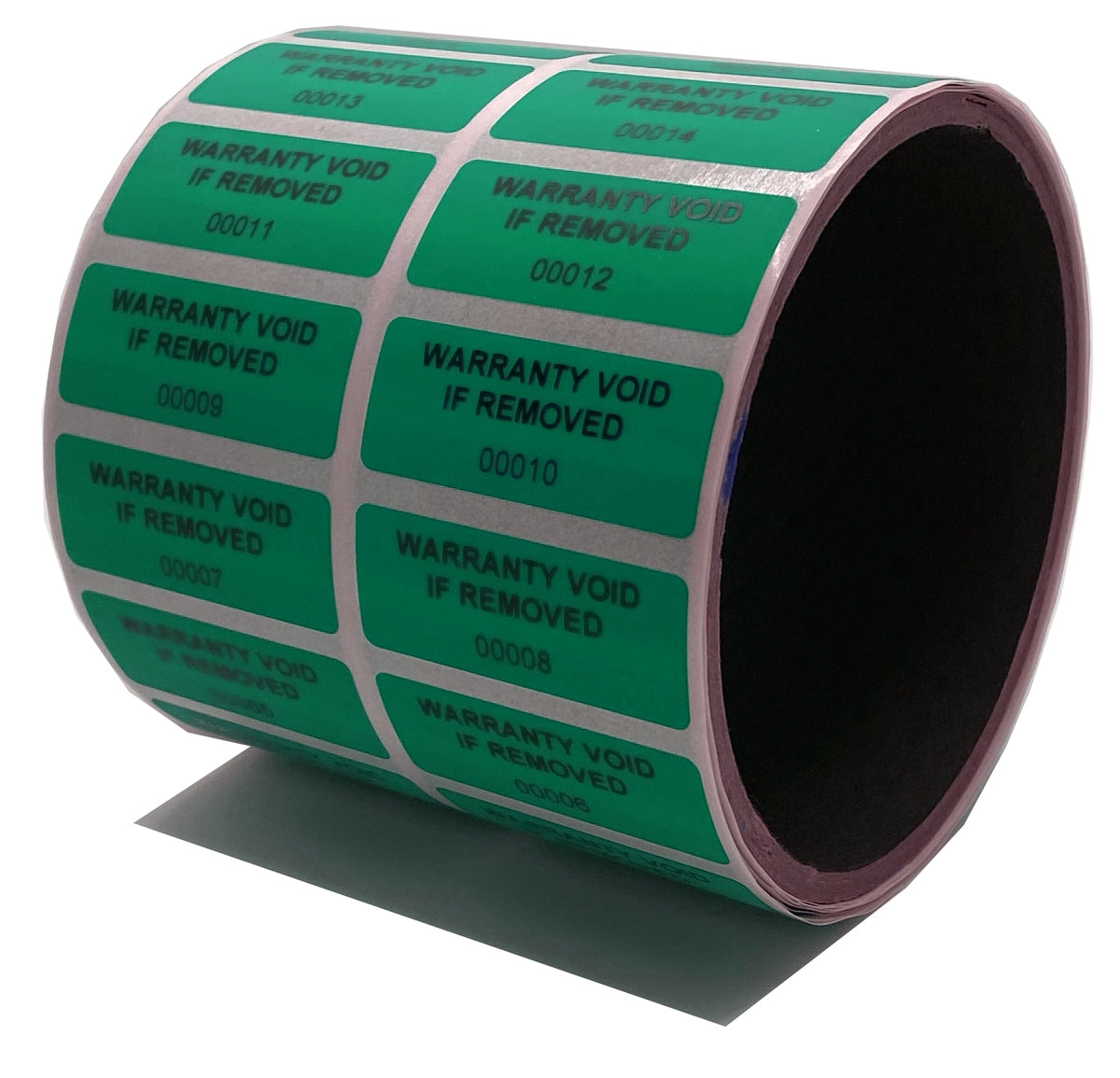 1,000 Tamper-Evident Green Non Residue Security Labels TamperGuard® Seal Sticker, Rectangle 1.5" x 0.6" (38mm x 15mm). Printed: Warranty Void if Removed + Serialized