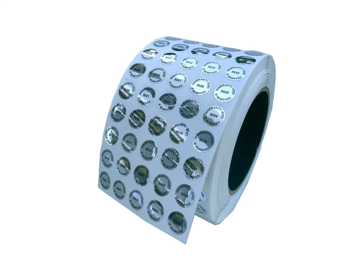 500 Tamper-Evident Metallic Silver / Chrome Non Residue Security Labels TamperGuard® Seal Sticker, Round/ Circle 0.75" diameter (19mm). Printed: Warranty Void if Removed + Serialized