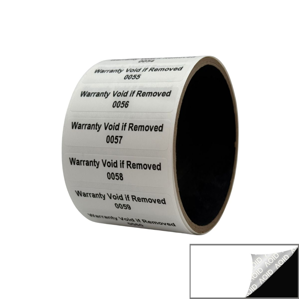 250 Tamper Evident White Non Residue Security Labels TamperGuard® Seal Sticker, Rectangle 2" x .5" (51mm x 13mm). Printed: Warranty Void if Removed + Serialized