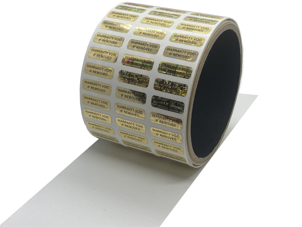 10,000 Gold Tamper Evident Holographic Gold Security Label Seal Sticker TamperMax®, Rectangle 0.75" x 0.25" (19mm x 6mm). Printed: Warranty Void if Removed.