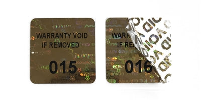 500 Gold Tamper Evident Holographic Security Label Seal Sticker TamperMax®, Square 1" x 1" (25mm x 25mm). Printed: Warranty Void if Removed + Serialization